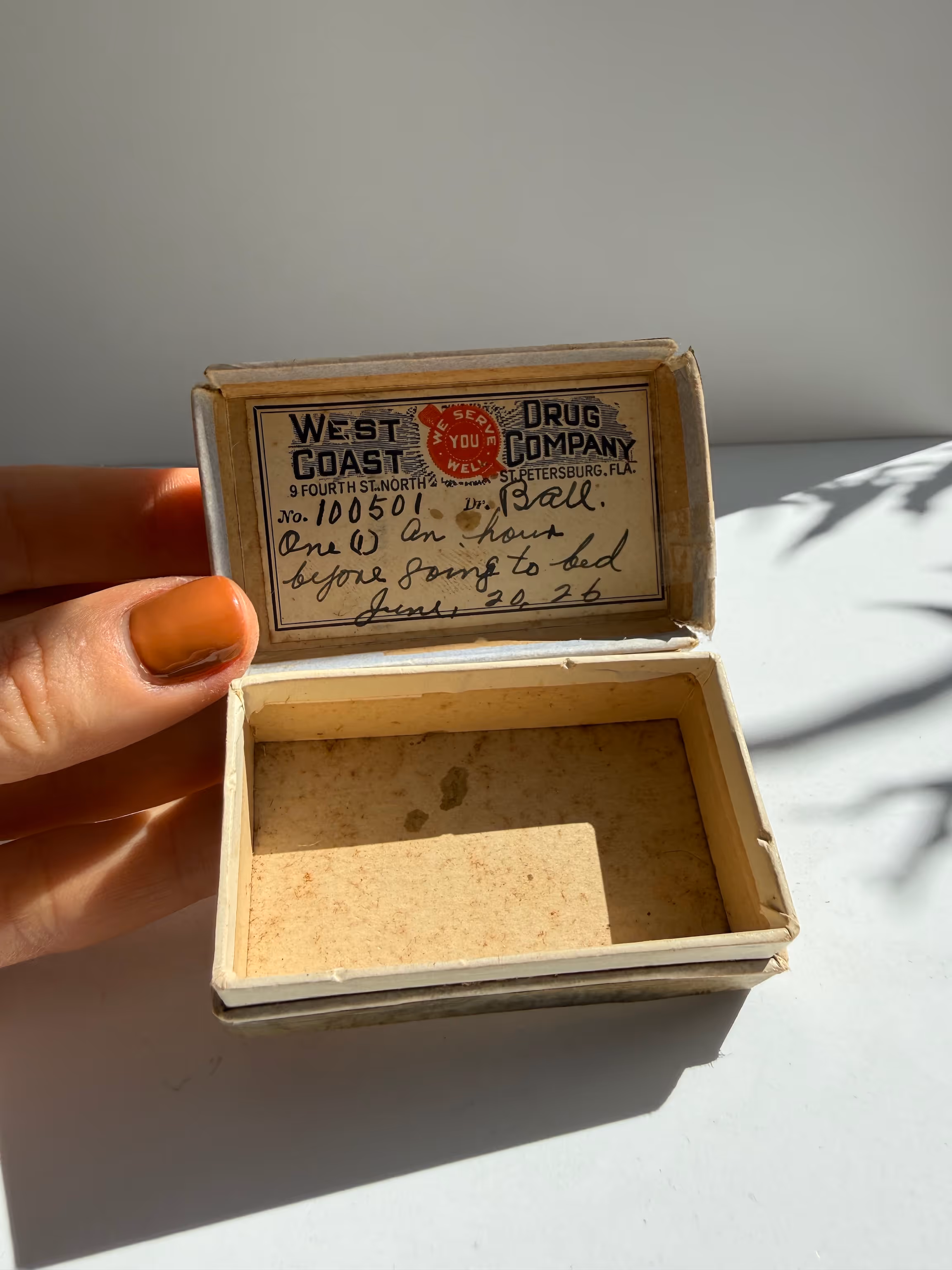 Antique cardboard pill box from the West Coast Drug Company, 9 Fourth Street North, St. Petersburg, Florida, dated June 20, 1926.