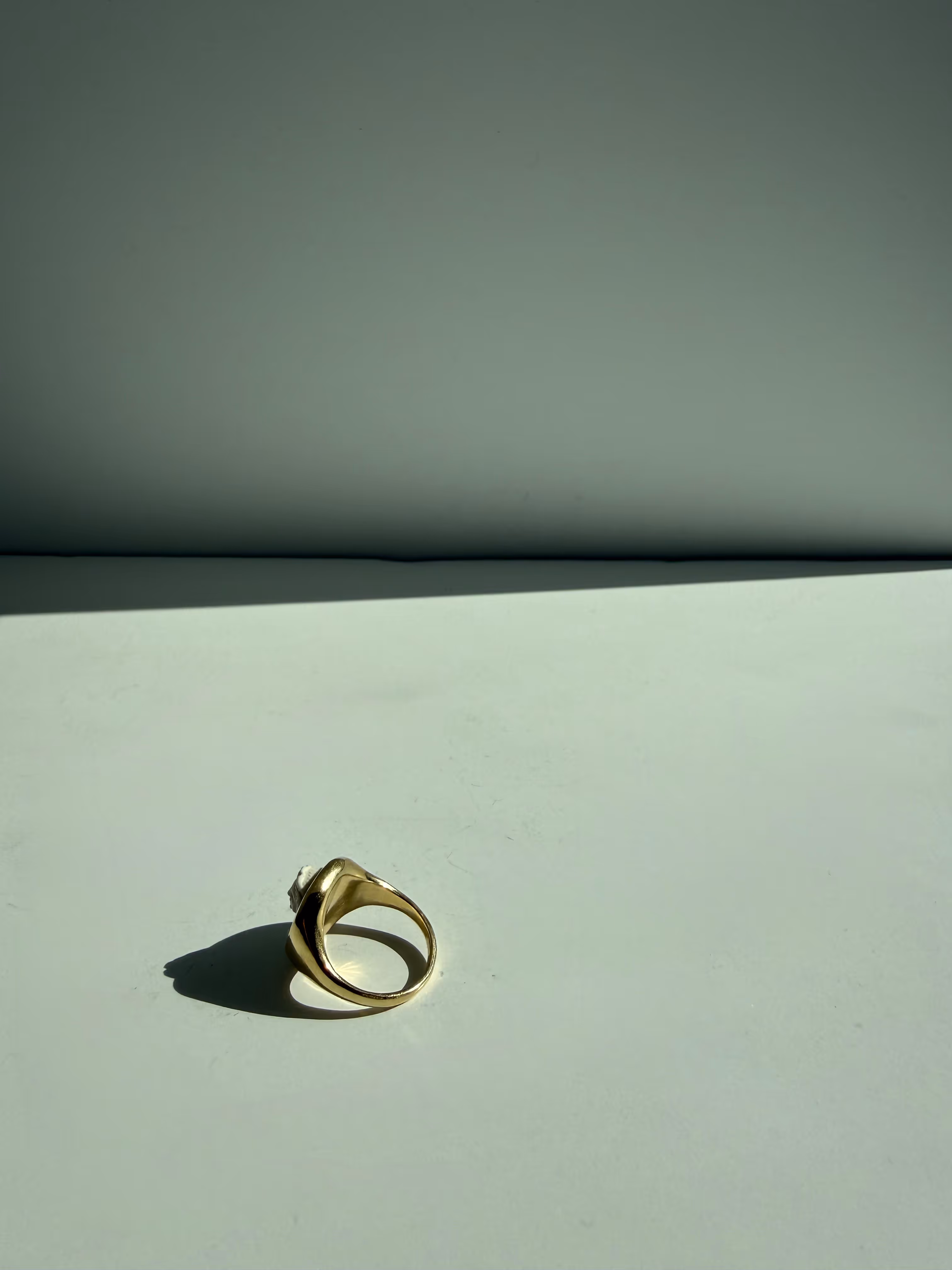 A rare white lava stone cameo depicting a classical portrait, set in a contemporary 14ct gold bezel.