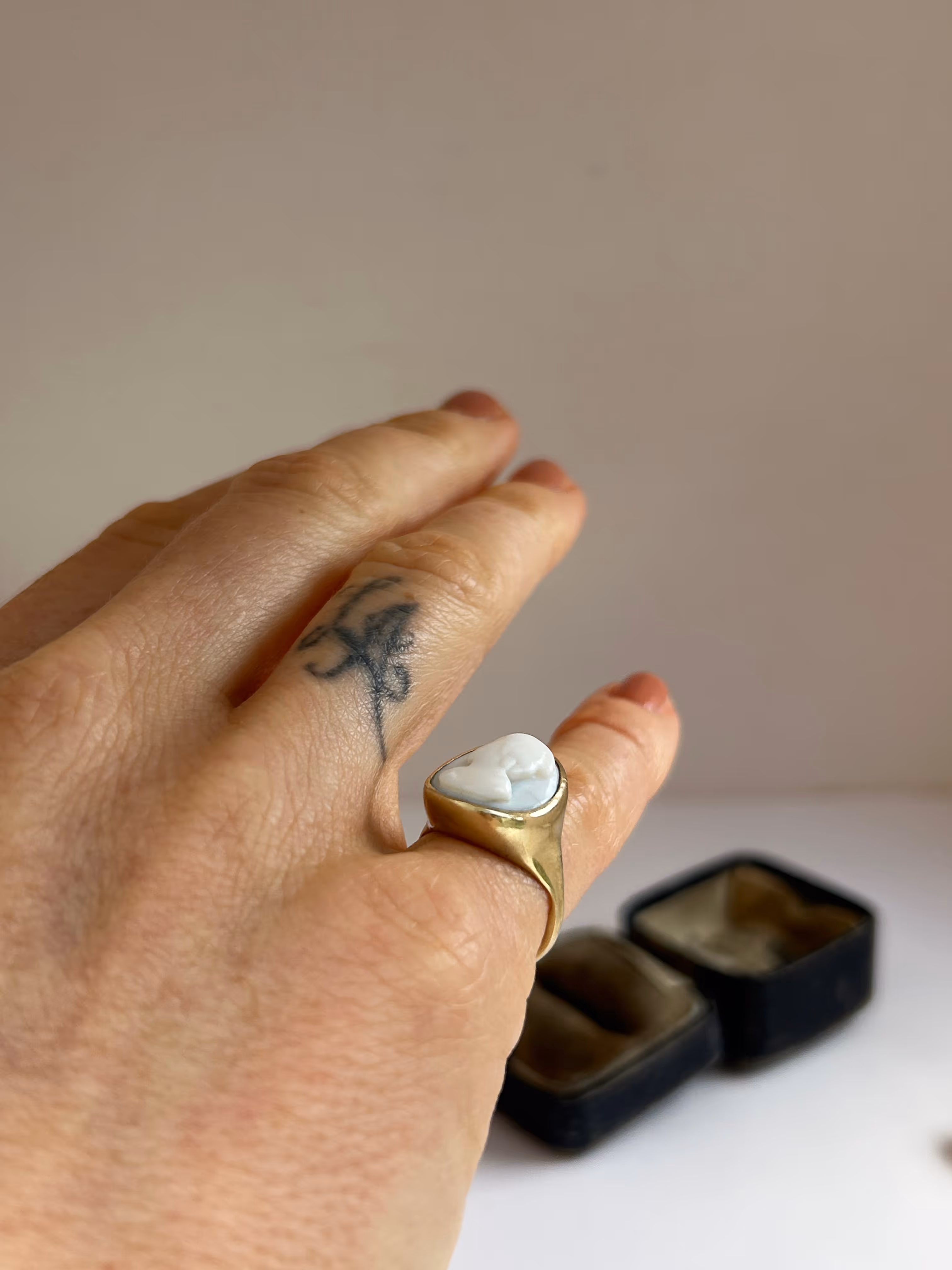 A delicate antique white lava stone cameo depicting a classical portrait, set in a contemporary 14ct gold bezel.