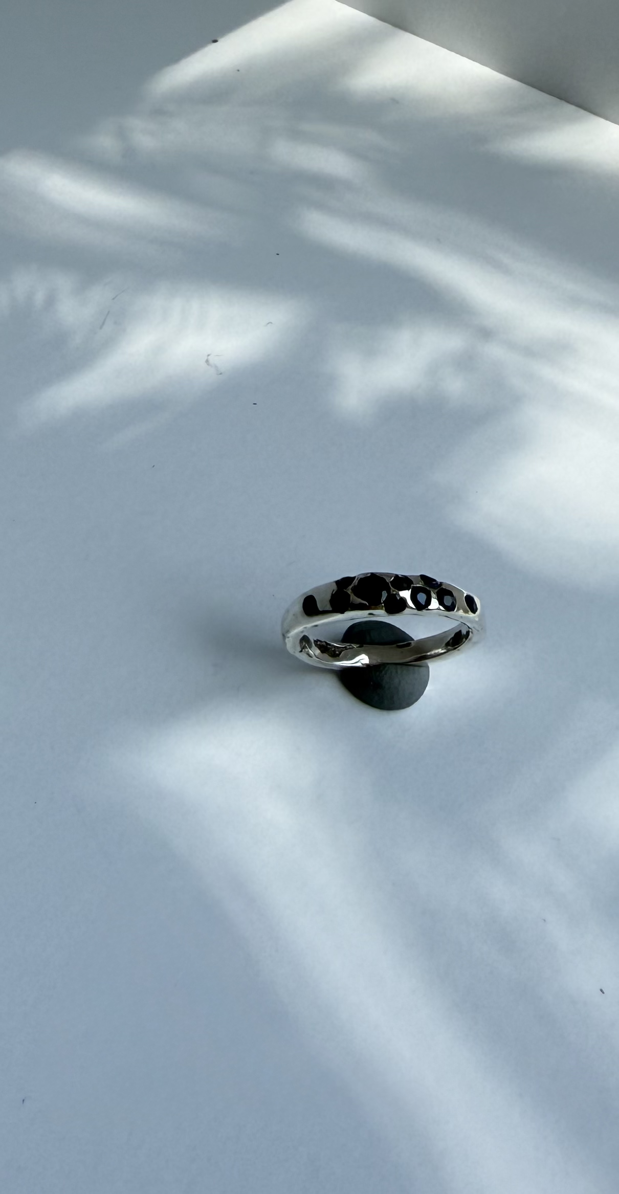 A hand-forged sterling band scattered with ten blue sapphires — ranging from deep midnight to soft ink, each stone slightly different in size and set flush into the organic surface of the metal.