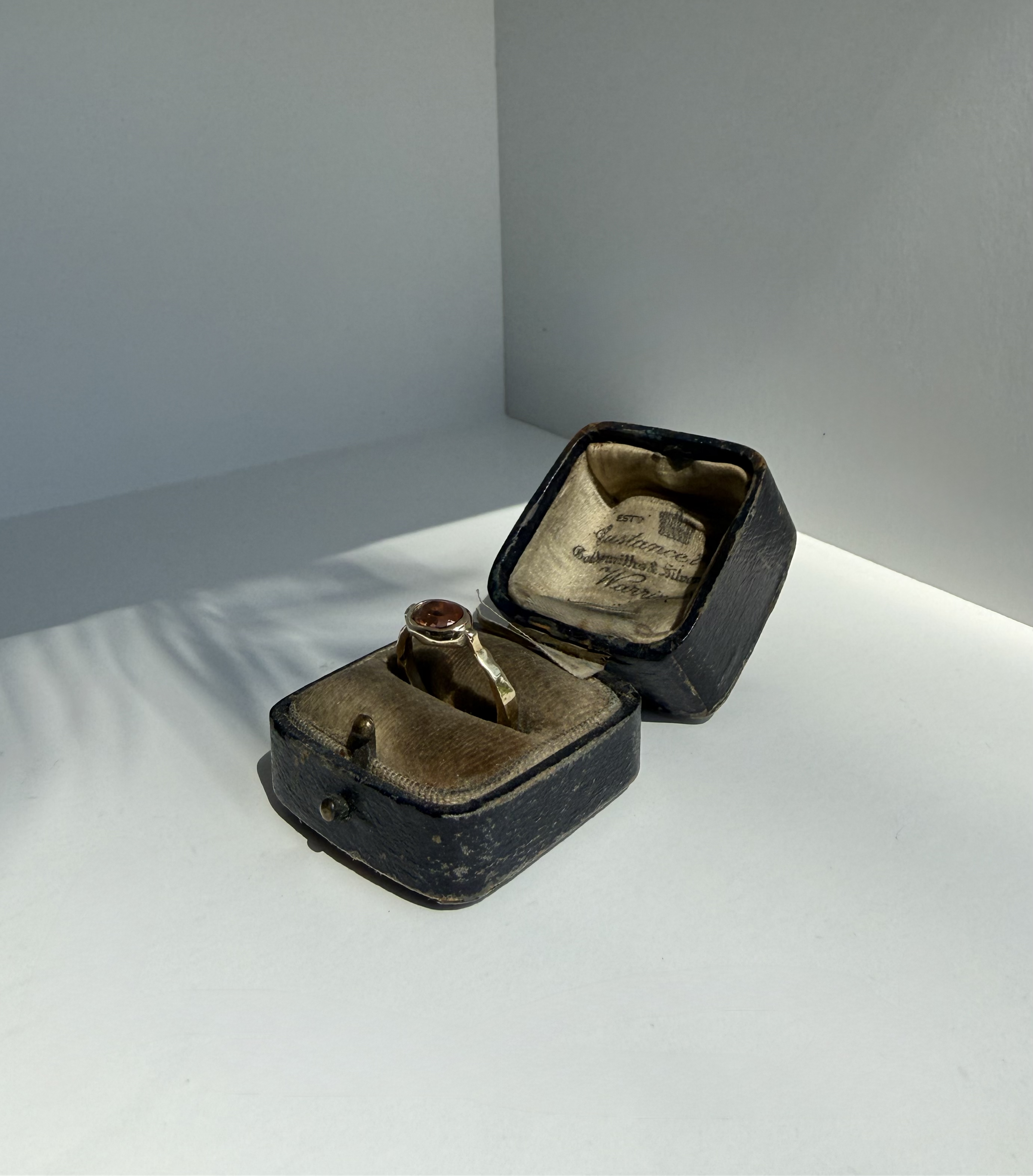 A hand-forged 14ct gold band with a single oval tourmaline in a warm peachy-brown, the color that shifts between amber and blush depending on the light.
