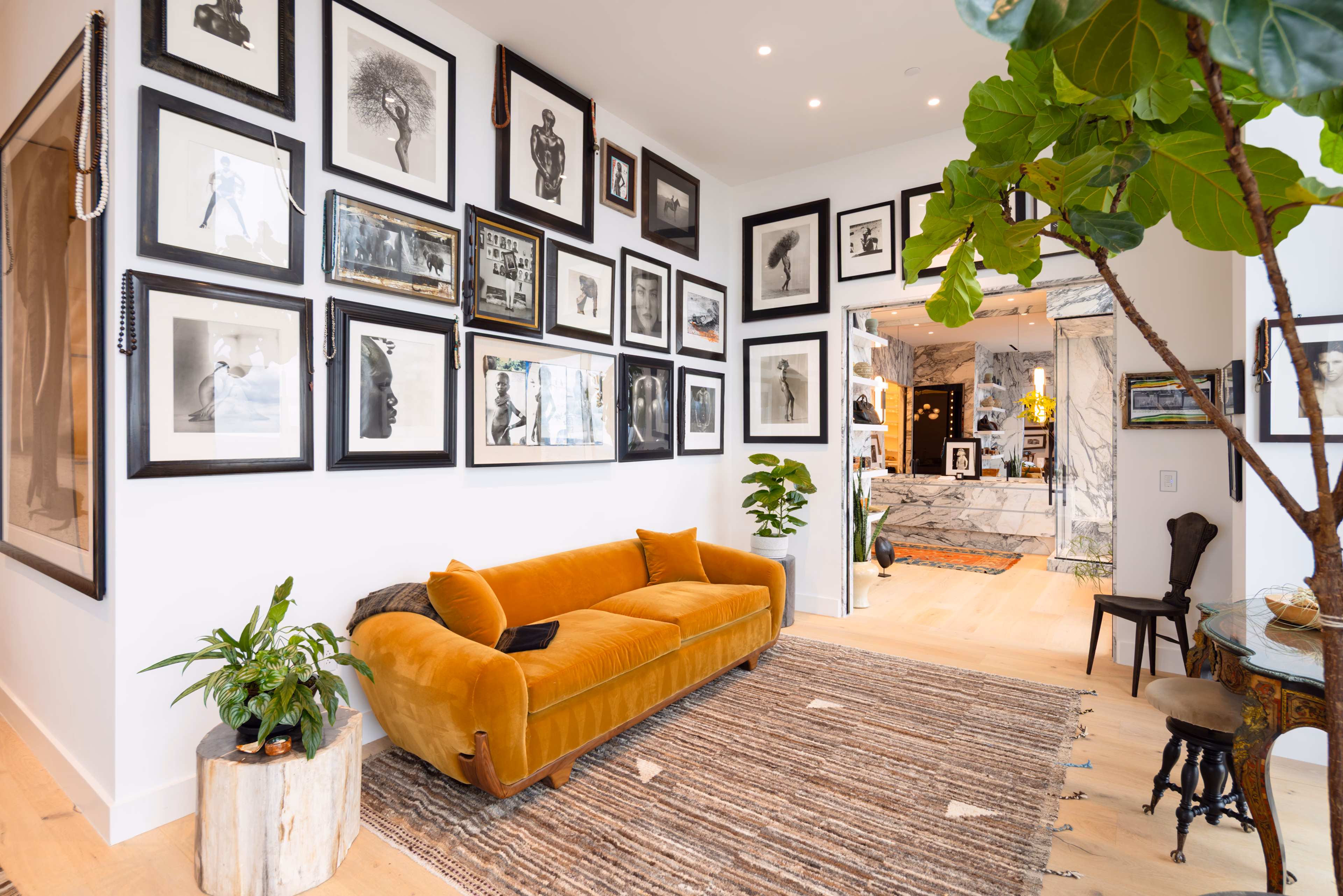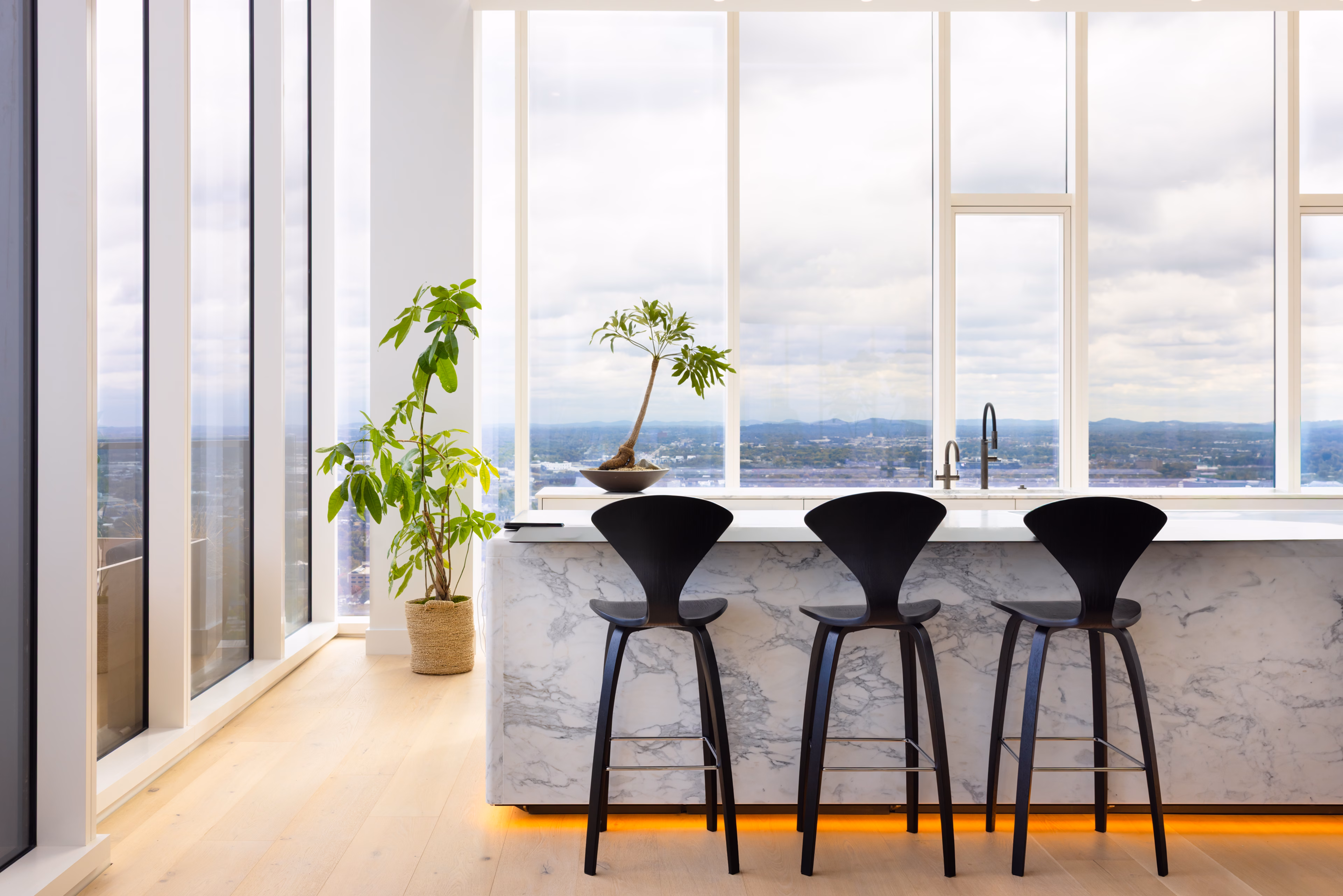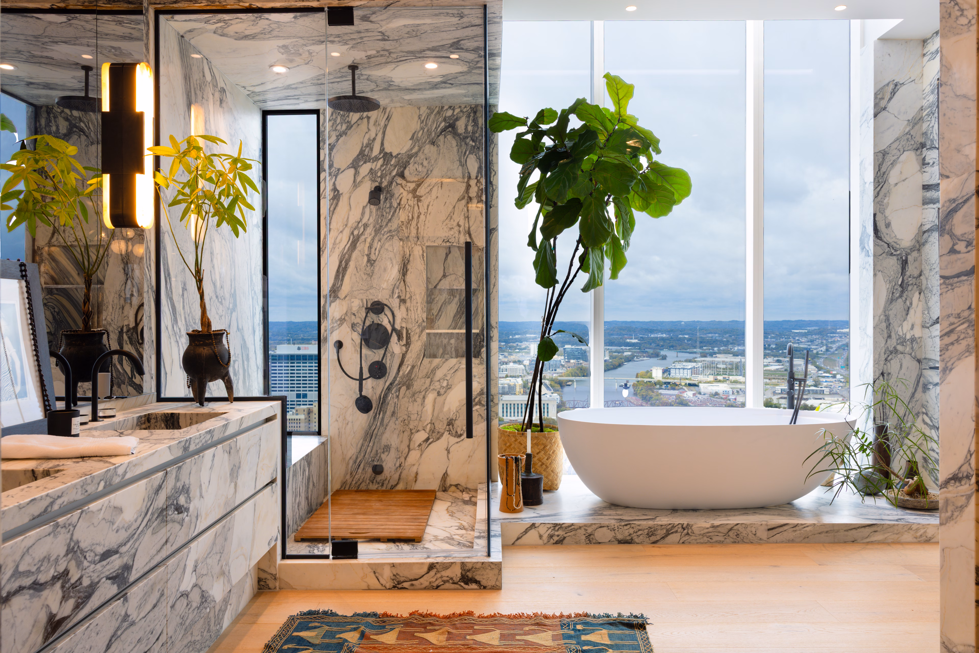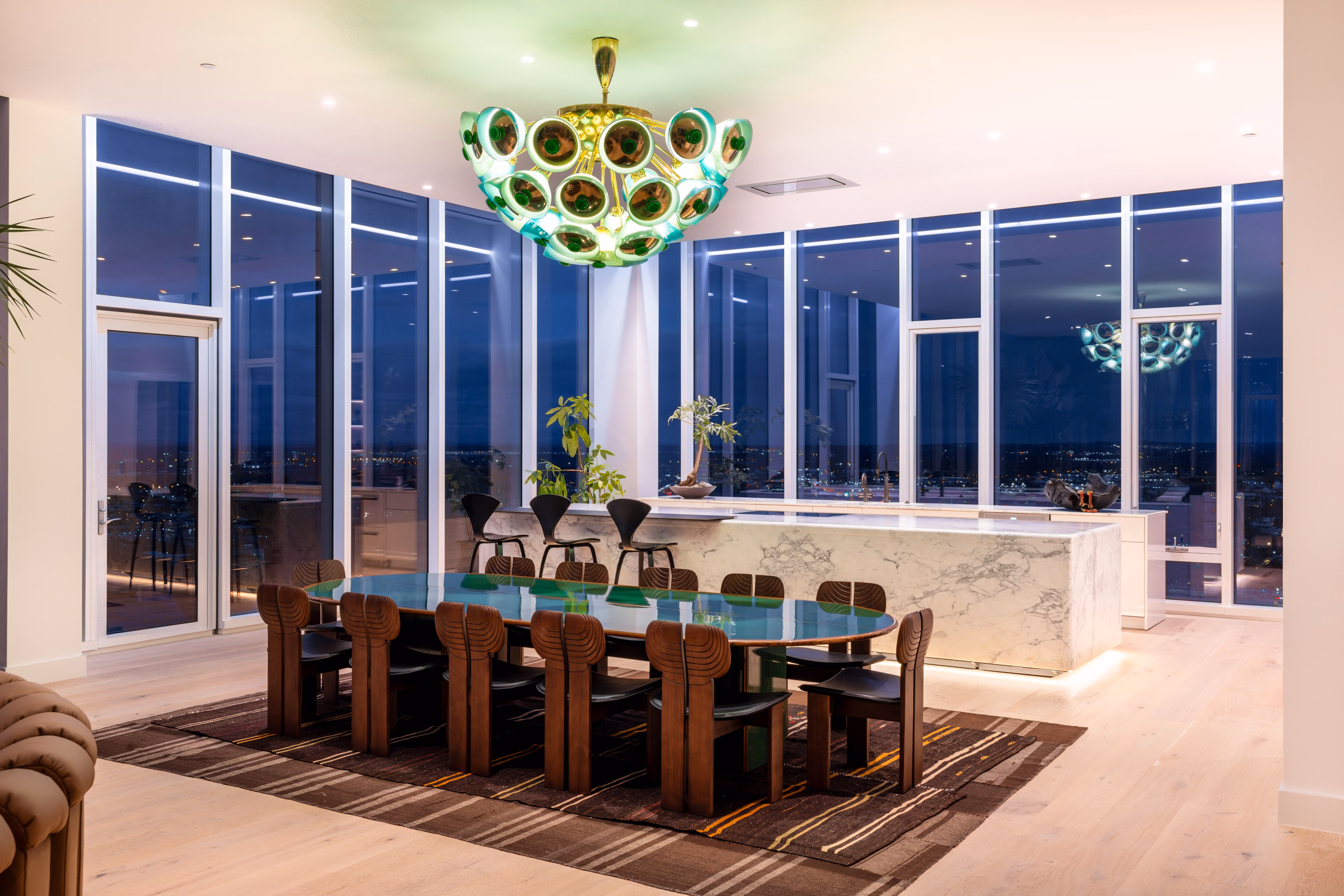 A full-floor residence designed around the particular rather than the polished. Vintage pieces sourced from France introduce warmth and history throughout, while the client's expansive art collection — anchoring entire walls in black-and-white photography — gives the home a deeply personal character. Strong color, organic material, and considered scale do the rest, all set against an uninterrupted sweep of the Nashville skyline.